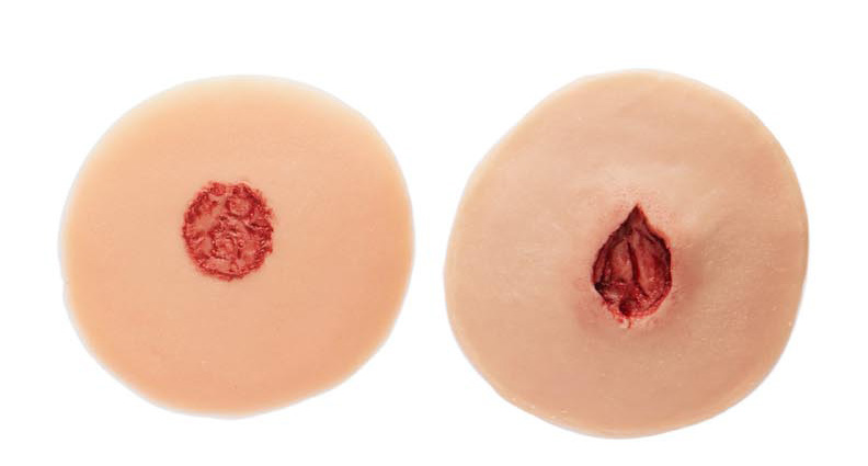 伤口贴片外观逼真,无需粘合剂可直接贴在模拟人或标准化病人身上使用。套装由不同配置,