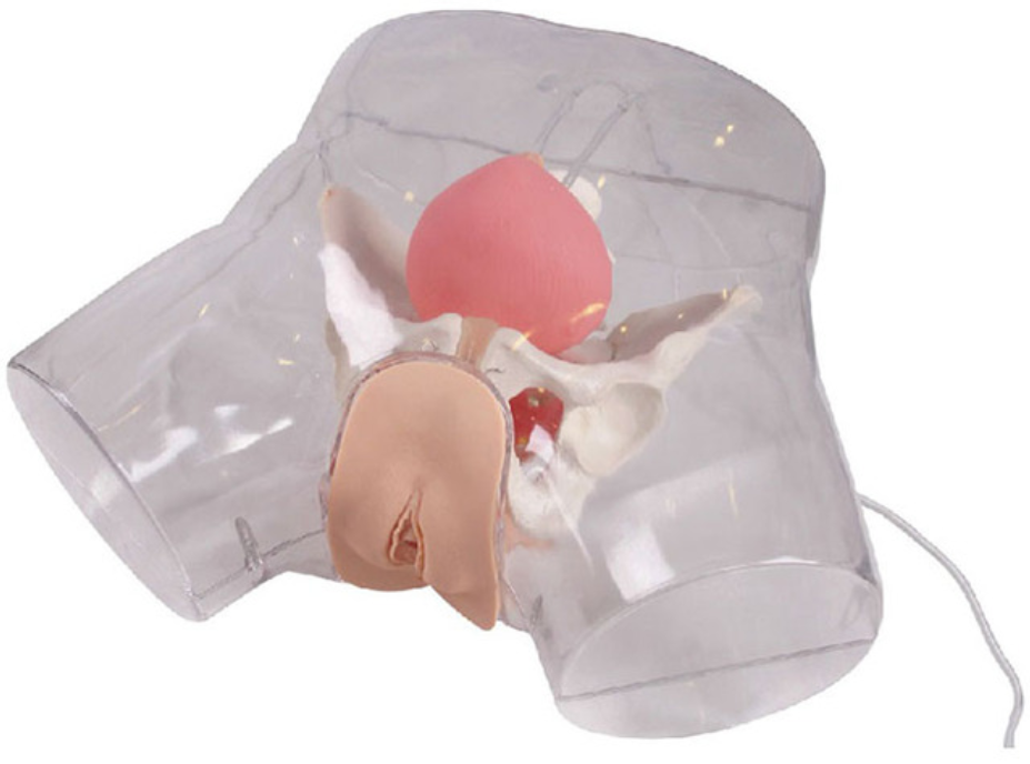 可通过透明的模型观察骨盆和膀胱的相对位置。骨盆位置固定,可以观察膀胱的位置和插入导管的角度。可使用临床标准双腔管或三腔管进行导尿。导管正确插入后,“尿液”才会流出。