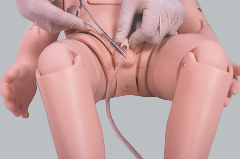 小儿导尿采用仰卧位体位,应根据年龄选用合适的导尿管,运用该模型可以进行标准的小儿导尿操作训练。